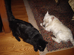Then there is Dudley, my West Highland White Terrorist (Oops! I mean Terrier). He comes from Tipton, Iowa, where his breeder retired in 2008, Duds being the last pup, which she reserved for me. My previous Westie (from the same breeder), Cody, died on July 18 of 2009 at the age of almost fifteen. He was much beloved by everyone who met him, and when he died in my arms that day, I was devastated. I phoned Marty, Cody’s breeder to find that she had one pup left from the final litter, and that she was retiring from raising Westies. Dudley was born the same day Cody died, so all signs pointed to my having him as my next dog. His father’s name was Cody II. That info prompted Jim to drive me all the way from Denver to Tipton, Iowa to get Duds when he was nine weeks old. I named him after the angel played by Cary Grant in the 1947 film, THE BISHOP’S WIFE. For the first few weeks he stayed in a crate at night in the sun room and was quickly house trained. Riggs accepted him almost immediately with what we believe was an attitude that this clumsy puppy was no threat to the urbane and sophistiacted Riggs, who when tired of the pup’s attempts to start a squabble or wrestling match, would simply walk up three of four stairs toward the second floor, knowing that Dudley was a devout coward when it came to any stairs. This remains true. Now the two of them still tumble around locked in bear hugs around the living room and sun room but are essentially buddies who would never dream of hurting each other.